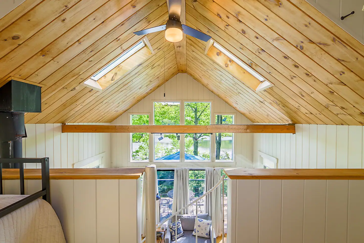 This Camden Maine cottage has spectacular views overlooking Hosmer Pond and Ragged Mountain. Lots of windows and skylights, comfortable contemporary furnishings, a fully equipped kitchen. Ideal for a couple or up 4 persons. Bright, modern and yet warm and cozy plenty of ambiance. A kayak and canoe on site and great swimming and fishing to be had at the pond. Wonderful deck. Tennis courts +hiking trails are across the street. Pets considered.